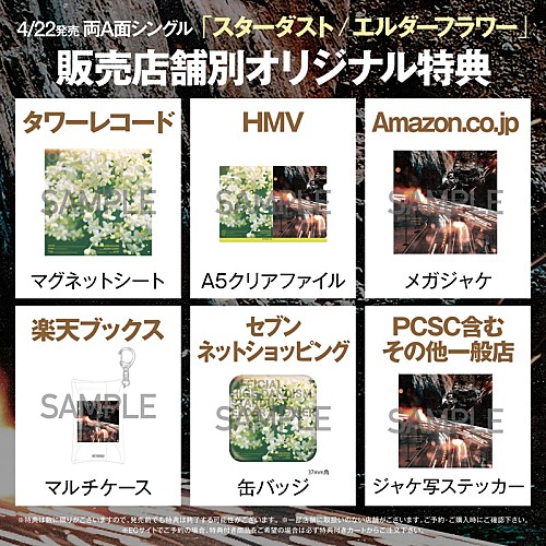 Official髭男dismが、4月22日にリリースする両A面シングル『スターダスト/エルダーフラワー』販売店舗別オリジナル特典の絵柄を公開した。 CDリリースに先駆けて配信リリースされる「スターダスト」「エルダーフラワー」のジャケット … 続きを読む